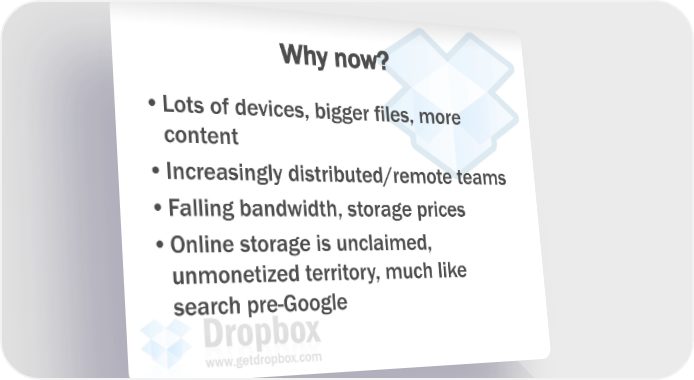 Why now? •Lots of devices, bigger files, more content •Increasingly distributed/remote teams •Falling bandwidth, storage prices •Online storage is unclaimed, unmonetized territory, much like search pre-Google