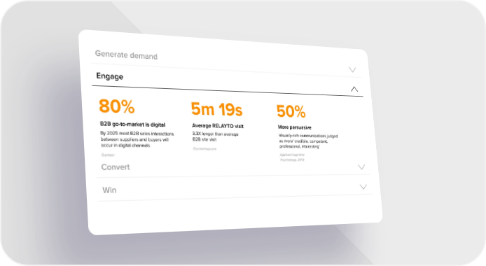 Generate demand Engage 80% 5m 19s 50% B2B go-to-market is digital Average RELAYTO visit More persuasive 3.3X longer than average By 2025 most B2B sales interactions Visually-rich communications judged B2B site visit between suppliers and buyers will as more ‘credible, competent, occur in digital channels professional, interesting’ Contentsquare Applied Cognitive Gartner Psychology, 2013 Convert Win
