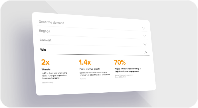 Generate demand Engage Convert Win 2x 1.4x 70% Win rate Faster revenue growth Higher revenue from investing in digital customer engagement Uplift in deals won when using Experience-focused businesses grow RELAYTO/ digital proposal and revenue 1.4x faster than their competitors State of Customer Engagement buyer reading rooms Report 2022, Twilio Forrester RELAYTO study