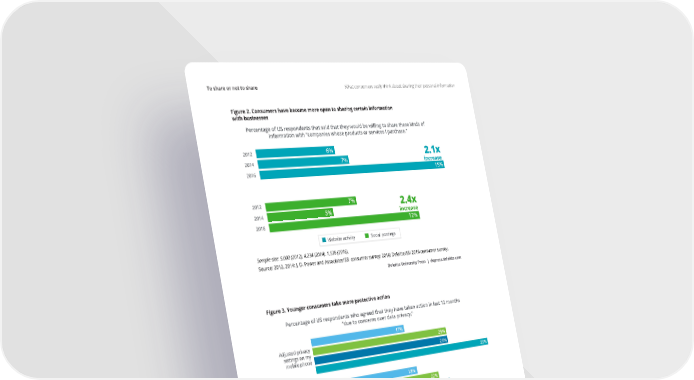 To share or not to share What consumers really think about sharing their personal information Figure 2. Consumers have become more open to sharing certain information with businesses Percentage of US respondents that said that they would be willing to share these kinds of information with “companies whose products or services I purchase.” 2012 6% 2.1x 2014 7% increase 2016 15% 2012 7% 2.4x 2014 5% increase 2016 12% Website activity Social postings Sample size: 5,000 (2012), 4,234 (2014), 1,538 (2016). Source: 2012, 2014: J. D. Power and Associates/SSI consumer survey; 2016: Deloitte/SSI 2016 consumer survey. Deloitte University Press | dupress.deloitte.com Figure 3. Younger consumers take more protective action Percentage of US respondents who agreed that they have taken action in last 12 months “due to concerns over data privacy.” 17% Adjusted privacy 25% settings on my mobile phone 25% 33% 18% Adjusted privacy 22% settings on 24% social media 26% 9% Provided fake 10% information to companies 13% 19% Boomers Gen X Gen Y Gen Z Sample size: 374 (Boomers), 306 (Gen X), 558 (Gen Y), 301 (Gen Z). Source: Deloitte/SSI 2016 consumer survey. Deloitte University Press | dupress.deloitte.com 33