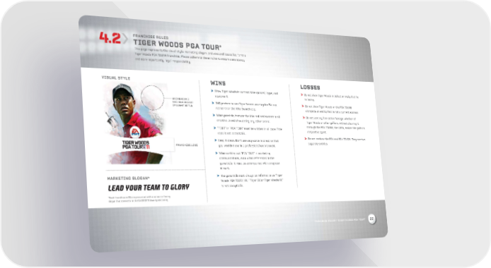 FRANCHISE RULES TIGER WOODS PGA TOUR® This page represents the visual style, marketing slogan, and wins and losses list for the Tiger Woods PGA TOUR® franchise. Please adhere to these rules to ensure consistency, and more importantly, legal responsibility. VISUAL STYLE WINS LOSSES > Show Tiger Woods in current Nike apparel, logos, and > Do not show Tiger Woods in defeat or imply that he equipment. is losing. BACKGROUND AND SECONDARY > IMG prefers to see Tiger Woods wearing his TW cap, > Do not show Tiger Woods or the PGA TOUR® IMAGERY STYLE rather than the Nike Swoosh cap. alongside an entity that is not a current sponsor. > When possible, feature the Nike ball and swoosh in all > Do not use any live-action footage, whether of creative. Avoid showcasing any other brand. Tiger Woods or other golfers, without clearing it > “TOUR” in “PGA TOUR” must be written in all caps. Title through the PGA TOUR®, the USGA, and/or the golfer’s caps is not acceptable. respective agent. > Keep it clean. Don’t use any words in creative that > Do not confuse the PGA and PGA TOUR®. They are two FRANCHISE LOGO you wouldn’t use in a professional environment. separate entities. > When writing out “PGA TOUR” in marketing communications, even when referenced in the game title, it must be accompanied with a register ® mark. MARKETING SLOGAN* > The game title must always be referred to as “Tiger Woods PGA TOUR® XX.” “Tiger XX or Tiger Woods XX” LEAD YOUR TEAM TO GLORY is not acceptable. *Each franchise will be represented with a consumer facing slogan that connects to the EA SPORTS brand positioning. ® FRANCHISE RULES / TIGER WOODS PGA TOUR 22 9