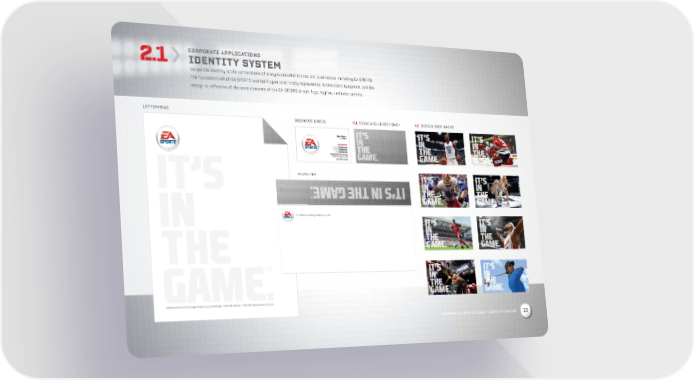 CORPORATE APPLICATIONS IDENTITY SYSTEM Corporate identity is the cornerstone of many successful brands and businesses, including EA SPORTS. The foundation which EA SPORTS was built upon is strongly represented in this identity system, and the design is reflective of the core elements of the EA SPORTS brand: logo, tagline, and color palette. LETTERHEAD BUSINESS CARDS V.1 STANDARD JERSEY BACK V.2 SCREEN SHOT BACKS Peter Moore President pmoore@ea.com Main: 650.628.1500 Direct: 650.628.1500 Mobile: 650.628.1500 Fax: 650.628.1353 209 Redwood Shores Parkway Redwood City, CA 94065 www.easports.com ENVELOPE 209 Redwood Shores Parkway Redwood City, CA 94065 209 Redwood Shores Parkway Redwood City, CA 94065 Tel: 650.628.1500 Fax: 650.628.1353 www.easports.com CORPORATE APPLICATIONS / IDENTITY SYSTEM 13 9