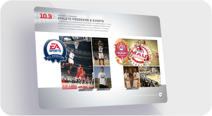PARTNERS & PROGRAMS ATHLETE PROGRAMS & EVENTS Throughout the years EA SPORTS has been the proud sponsor of many sports programs, including the Maui Invitational, one of the nation’s premier NCAA Men’s College Basketball regular season tournaments, as well as the EA SPORTS All-American Program, McDonald’s All-American Game, and more. It’s partnerships such as these that keep EA SPORTS a big-time player in sports. LeBron James Tim Tebow 2009 MVP’S PARTNERS & PROGRAMS / ATHLETE PROGRAMS & EVENTS 58 9