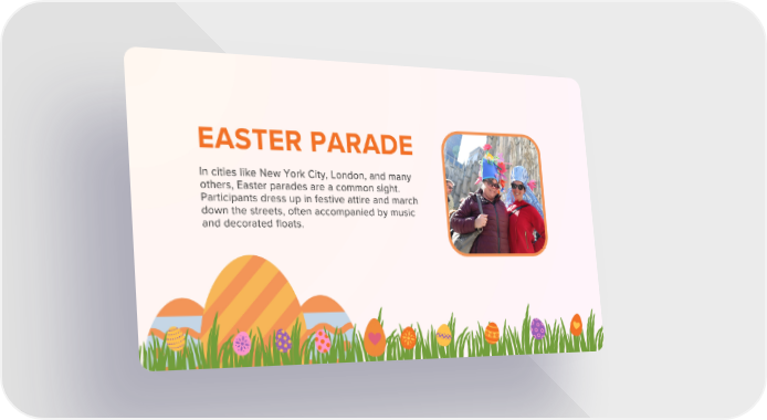 EASTER PARADE In cities like New York City, London, and many others, Easter parades are a common sight. Participants dress up in festive attire and march down the streets, often accompanied by music and decorated floats.