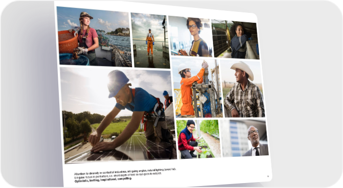 Attention to diversity in context of industries, intriguing angles, natural lighting (avoid flat). Singular focus in portraiture, i.e. short depth of field so eye goes to subject. Optimistic, inviting, inspirational, compelling. 11