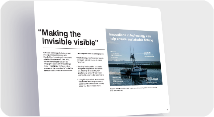 “ Making the Innovations in technology can help ensure sustainable fishing invisible visible” . HIGH-TECH GPS ANTENNA While we encourage featuring images • Partners prefer not to be photographed. VIDEO CAMERAS Provides location and of our partners/allies along with Capture high-resolution time of fishing activities Fourth Wave technology (i.e. methane • The technology itself is not photogenic fishing imagery satellite, Google sensor cars, etc.), or visually compelling, i.e. an unsexy we sometimes opt to use a more “gray box.” infographic approach in visualizing a story—highlighting the key parts or • Shooting the innovation as a whole process of the innovation to “make the along with the partner is not realistic invisible visible”—for various reasons: (i.e. shooting smart boat system positioned all over a 30-foot vessel and the fisherman in the same frame). HYDRAULIC AND ELECTRONIC • Using this approach to create content ROTATION SENSORS MONITORING COMPUTER would better serve target audience/ Trigger video cameras Records fishing vessel’s persona who is interested in learning to record the catch telemetry and video data about how the innovation works. Sample of “making the invisible visible” graphic approach, here using callouts knocked out to white on full-color photography. 13