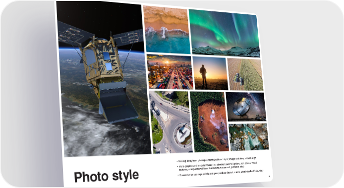• Moving away from photojournalistic/editorial style; image and story should align • More graphic and singular focus (i.e. attention paid to lighting, rich colors, visual textures, compositional lines that create movement, patterns, etc.) Photo style • Presents new vantage points and perspectives (aerial, macro, short depth of field, etc.) 8