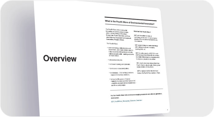 What is the Fourth Wave of Environmental Innovation? The Fourth Wave of Environmental What isn’t the Fourth Wave? Innovation empowers people to take action. When putting a story/topic NOT just innovation or data, or through the Fourth Wave lens, all three technology on its own. It must empower elements must be present and explored: people and drive action that benefits the Innovation, People, Action environment. The Fourth Wave: NOT people doing environmental things • Uses technology, data analytics and with nothing timely and innovative visualization, and digital collaboration to spurring them on. make environmental problems not only NOT the sole property of EDF. We must visible but actionable—scaling solutions acknowledge that others are also driving as never before. environmental progress using innovation Overview • Empowers everyone. to empower people to take action. • Is forward-looking and optimistic. NOT one-to-one corporate partnerships. Fourth Wave is about scale—think global supply chains and coalitions. • Is inclusive versus competitive. NOT a replacement for the first three • I s necessary—21st century problems waves; the Fourth Wave builds on them. require 21st century solutions. • Unleashes the power of human ingenuity to make sure that humankind —and the environment we depend on— can thrive and prosper. For the Fourth Wave full overview/messaging document and editorial guidelines, click below: EDF_FourthWave_Messaging_Overview_final.docx 2