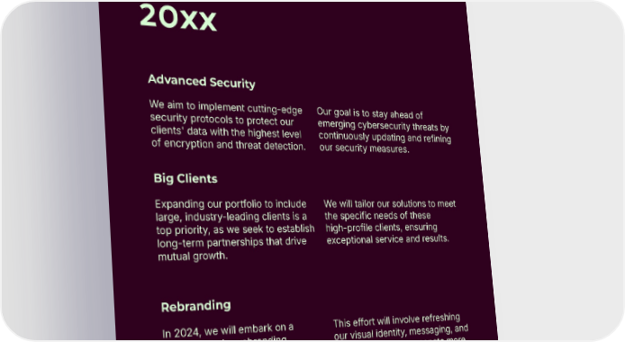 Goals for 20xx A dv an c ed Secur it y We aim to implement cutting-edge Our goal is to stay ahead of security protocols to protect our emerging cybersecurity threats by clients' data with the highest level continuously updating and refining of encryption and threat detection. our security measures. Big Clients Expanding our portfolio to include We will tailor our solutions to meet large, industry-leading clients is a the specific needs of these top priority, as we seek to establish high-profile clients, ensuring long-term partnerships that drive exceptional service and results. mutual growth. Rebr an din g In 2024, we will embark on a This effort will involve refreshing comprehensive rebranding our visual identity, messaging, and initiative to modernize our image online presence to resonate more and better reflect our core values effectively with our target and innovative spirit. audience.