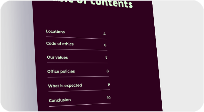 Table of contents L ocations 4 C ode of ethics 6 Our v alues 7 Offic e polic ies 8 What is e xpec ted 9 C on c lusion 10