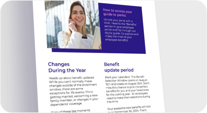 ENROLLMENT FOR YOUR BENEFITS IN 2024 How to access your guide to perks: Unlock your perks with a click! Head to the "Benefits" section in your employee portal and flip through our digital guide. Go explore and make the most of your employee benefits! Changes Benefit During the Year update period Heads up about benefit updates! Mark your calendars! The Benefit While you can't normally make Selection Window opens on August changes outside of the enrollment 15th and closes on August 25th. Don't window, there are some miss this chance to pick the perfect exceptions for life events. Think benefits for you and your loved ones getting married, welcoming a new for the coming year. All employees family member, or changes in your need to make their selections during dependents' coverage. this time. If any of these big moments Your awesome new benefits will kick happen during the year, just let in on September 1st, 2024. That's HR know within 30 days and we right, get ready to experience all the can help you update your benefits great things your benefits package accordingly. has to offer! Enroll here