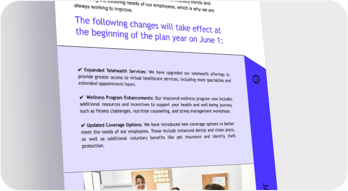 5 EMPLOYEE BENEFITS / UPDATES PAGE Updates We recognize the importance of keeping up with industry trends and addressing the evolving needs of our employees, which is why we are always working to improve. The following changes will take effect at the beginning of the plan year on June 1: ✔ Expanded Telehealth Services: We have upgraded our telehealth offerings to provide greater access to virtual healthcare services, including more specialties and extended appointment hours. ✔ Wellness Program Enhancements: Our improved wellness program now includes additional resources and incentives to support your health and well-being journey, such as fitness challenges, nutrition counseling, and stress management workshops. ✔ Updated Coverage Options: We have introduced new coverage options to better meet the needs of our employees. These include enhanced dental and vision plans, as well as additional voluntary benefits like pet insurance and identity theft protection. JANUAR Y - JUNE