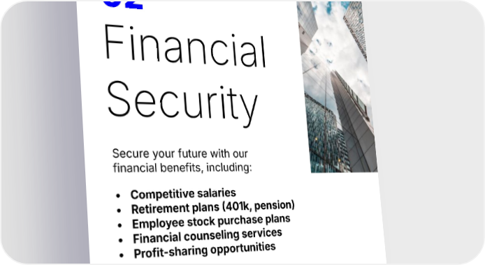 02 Financial Security Secure your future with our financial benefits, including: • Competitive salaries • Retirement plans 401k, pension) • Employee stock purchase plans • Financial counseling services • Profit-sharing opportunities Plan for tomorrow, today.