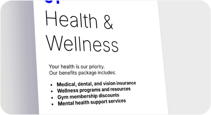 01 Health & Wellness Your health is our priority. Our benefits package includes: • Medical, dental, and vision insurance • Wellness programs and resources • Gym membership discounts • Mental health support services Stay healthy, stay happy!