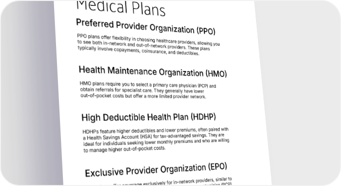 Medical Plans Preferred Provider Organization PPO PPO plans offer flexibility in choosing healthcare providers, allowing you to see both in-network and out-of-network providers. These plans typically involve copayments, coinsurance, and deductibles. Health Maintenance Organization HMO HMO plans require you to select a primary care physician PCP) and obtain referrals for specialist care. They generally have lower out-of-pocket costs but offer a more limited provider network. High Deductible Health Plan HDHP HDHPs feature higher deductibles and lower premiums, often paired with a Health Savings Account HSA) for tax-advantaged savings. They are ideal for individuals seeking lower monthly premiums and who are willing to manage higher out-of-pocket costs. Exclusive Provider Organization EPO EPO plans offer coverage exclusively for in-network providers, similar to an HMO, but without the requirement for a primary care physician PCP or referrals. 5