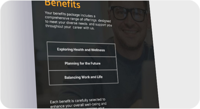 Learn Your Benefits Your benefits package includes a comprehensive range of offerings designed to meet your diverse needs and support you throughout your career with us. Exploring Health and Wellness Planning for the Future Balancing Work and Life Each benefit is carefully selected to enhance your overall well-being and professional success, making your journey with us rewarding and fulfilling. 3