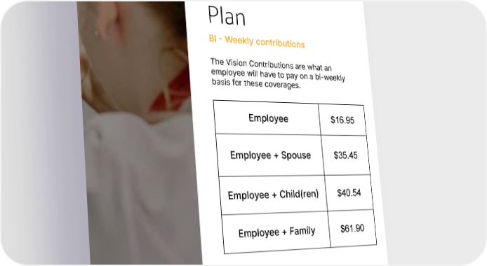Vision Plan BI Weekly contributions The Vision Contributions are what an employee will have to pay on a bi-weekly basis for these coverages. Employee $16.95 Employee + Spouse $35.45 Employee + Child(ren) $40.54 Employee + Family $61.90 9