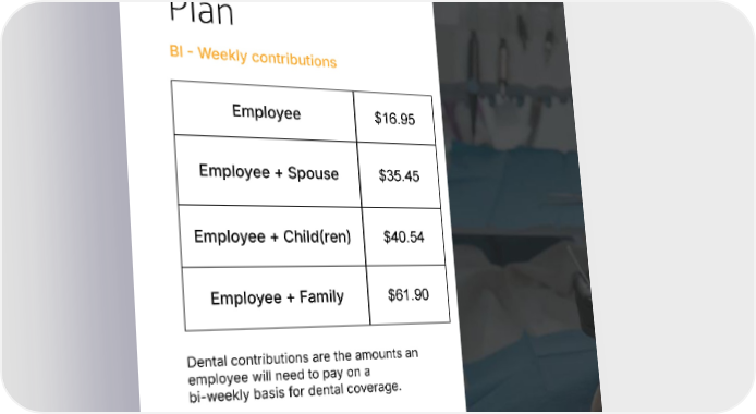Dental Plan BI Weekly contributions Employee $16.95 Employee + Spouse $35.45 Employee + Child(ren) $40.54 Employee + Family $61.90 Dental contributions are the amounts an employee will need to pay on a bi-weekly basis for dental coverage. 6