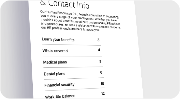 Contents & Contact Info Our Human Resources HR) team is committed to supporting you at every stage of your employment. Whether you have inquiries about benefits, need help understanding HR policies and procedures, or seek assistance with workplace concerns, our HR professionals are here to assist you. 3 Learn your benefits 4 Whoʼs covered 5 Medical plans 6 Dental plans Financial security 10 12 Work-life balance 14 Career Development Benefits 2