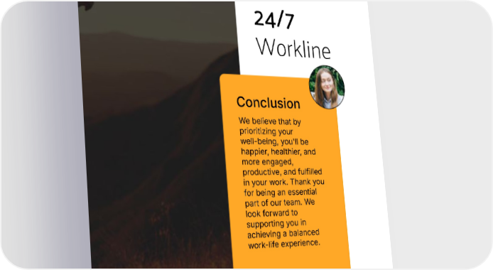 24/7 Workline Conclusion We believe that by prioritizing your well-being, you'll be happier, healthier, and more engaged, productive, and fulfilled in your work. Thank you for being an essential part of our team. We look forward to supporting you in achieving a balanced work-life experience. 13