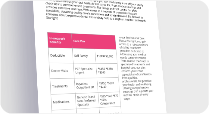 VISION PLANS With our dental insurance plan at Starlight, you can confidently show off your pearly whites, assured that your oral health is well cared for. From routine cleanings and check-ups to comprehensive procedures like fillings and root canals, our plan provides extensive coverage. With access to a network of trusted dentists and specialists, obtaining quality care is convenient and straightforward. Bid farewell to concerns about expensive dental bills and say hello to a brighter, healthier smile with Starlight! In our Professional Care Plan at Starlight, you gain In-network Core Pro access to a robust network benefits of skilled healthcare providers dedicated to addressing your medical Deductible Self Family $1,800 $3,600 needs comprehensively. From routine check-ups to specialized treatments and hospital care, our plan PCP Specialist *$450 *$280 Doctor Visits ensures you receive Urgent *$240 top-notch medical attention from qualified professionals. We prioritize Inpatient *$450 *$280 Treatments your health and well-being, Outpatient ER *$240 offering comprehensive coverage that supports your medical needs at every Generic Brand *$15 *$40 *$70 stage. Medications Non-Preferred *60% Specialty Coinsurance Maximum Self $5,500 $11,000 Out-of-Pocket Family EE EE + Spouse Monthly $40 $70 $120 EE + Dep(s) EE + Premiums $140 Fam