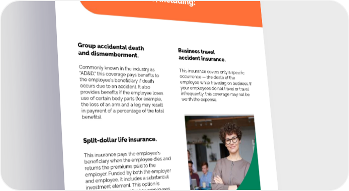 There are other types of insurance that you can offer besides group-term life, including: Group accidental death Business travel and dismemberment. accident insurance. Commonly known in the industry as This insurance covers only a specific "AD&D," this coverage pays benefits to occurrence — the death of the the employee's beneficiary if death employee while traveling on business. If occurs due to an accident. It also your employees do not travel or travel provides benefits if the employee loses infrequently, this coverage may not be use of certain body parts (for example, worth the expense. the loss of an arm and a leg may result in payment of a percentage of the total benefits). Split-dollar life insurance. This insurance pays the employee's beneficiary when the employee dies and returns the premiums paid to the employer. Funded by both the employer and employee, it includes a substantial investment element. This option is typically considered for key employees rather than the entire employee group.