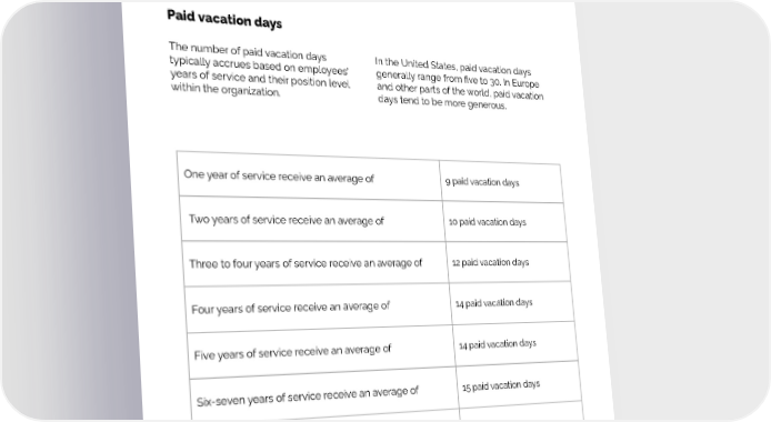 Paid Vacation Time Paid vacation days The number of paid vacation days In the United States, paid vacation days typically accrues based on employees' generally range from five to 30. In Europe years of service and their position level and other parts of the world, paid vacation within the organization. days tend to be more generous. 9 paid vacation days One year of service receive an average of 10 paid vacation days Two years of service receive an average of 12 paid vacation days Three to four years of service receive an average of 14 paid vacation days Four years of service receive an average of 14 paid vacation days Five years of service receive an average of 15 paid vacation days Six-seven years of service receive an average of 21 paid vacation days More than 15 years of service receive an average of