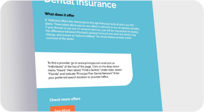 Dental Insurance What does it offer E. Wellness offers two dental plans through Principal, both of which are PPO plans. These plans allow you to use either in-network or out-of-network benefits. If you choose to use out-of-network dentists, you will be responsible for paying the difference between Principal’s allowed amount and what the dentist may charge, also known as "balance billing." The charts below provide a brief overview of the plans. To find a provider, go to www.principal.com and click on "Individuals" at the top of the page. Click on the drop-down menu "Insure," then select "Find a Dentist." Under state, select "Florida" and indicate "Principal Plan Dental Network." Enter your preferred search location or provider/office. Check more offers See More