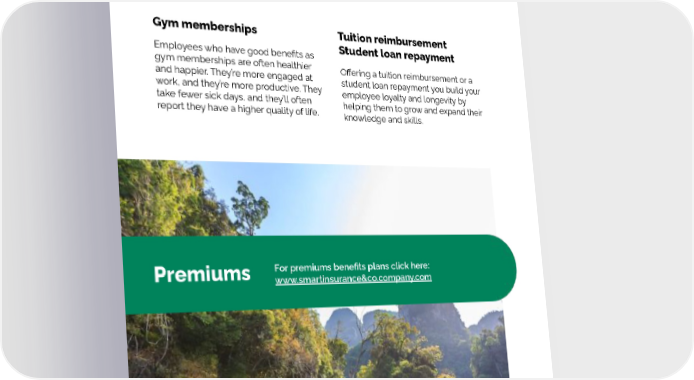 Additional Benefits Gym memberships Tuition reimbursement Student loan repayment Employees who have good benefits as gym memberships are often healthier Offering a tuition reimbursement or a and happier. They’re more engaged at student loan repayment you build your work, and they’re more productive. They employee loyalty and longevity by take fewer sick days, and they’ll often helping them to grow and expand their report they have a higher quality of life. knowledge and skills. For premiums benefits plans click here: Premiums www.smartinsurance&co.company.com