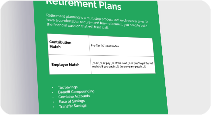 401(k) and Retirement Plans Retirement planning is a multistep process that evolves over time. To have a comfortable, secure—and fun—retirement, you need to build the financial cushion that will fund it all. Contribution Pre-Tax ROTH After-Tax Match _% of _% of pay _% of the next _% of pay To get the full Employer Match match: If you put in _% the company puts in _% • Tax Savings • Benefit Compounding • Combine Accounts • Ease of Savings • Transfer Savings