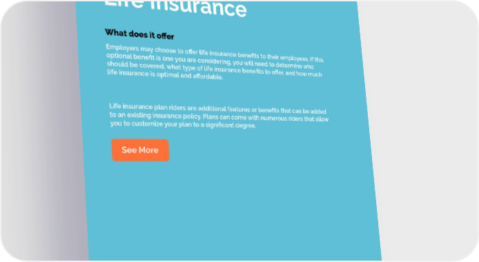 Life Insurance What does it offer Employers may choose to offer life insurance benefits to their employees. If this optional benefit is one you are considering, you will need to determine who should be covered, what type of life insurance benefits to offer, and how much life insurance is optimal and affordable. Life insurance plan riders are additional features or benefits that can be added to an existing insurance policy. Plans can come with numerous riders that allow you to customize your plan to a significant degree. See More