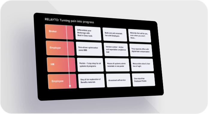Data-driven optimization saves $$$ Employer Version control = Active and reportable compliance trail Truly separate offers with digital total compensation Differentiate your Brokerage with Best in Class tools Broker Build and edit materials live with Employers Materials that sell for you, even when you aren’t there… Portals = 1 stop shop for all systems & programs HR House all systems admin materials in one portal Measurable value & clear line of sight Easy & fun exploration of Benefits materials Employee AI-assisted self-service One-stop-shop Employee Portals RELAYTO: Turning pain into progress