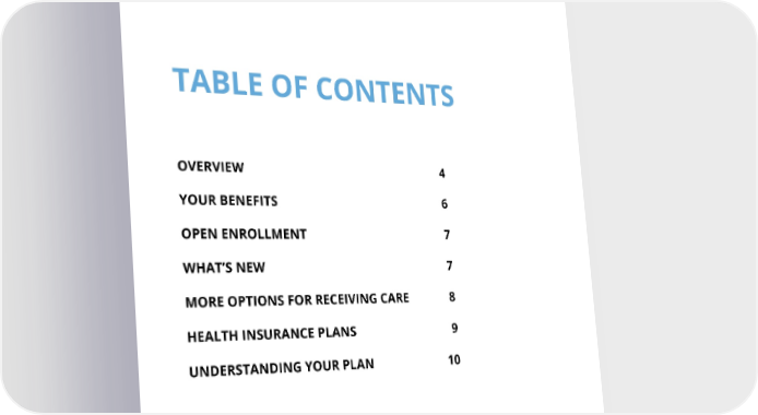 TABLE OF CONTENTS OVERVIEW 4 YOUR BENEFITS 6 OPEN ENROLLMENT 7 WHAT’S NEW 7 MORE OPTIONS FOR RECEIVING CARE 8 HEALTH INSURANCE PLANS 9 UNDERSTANDING YOUR PLAN 10