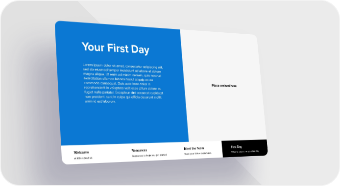 Your First Day Lorem ipsum dolor sit amet, consectetur adipiscing elit, sed do eiusmod tempor incididunt ut labore et dolore magna aliqua. Ut enim ad minim veniam, quis nostrud exercitation ullamco laboris nisi ut aliquip ex ea commodo consequat. Duis aute irure dolor in Place embed here reprehenderit in voluptate velit esse cillum dolore eu fugiat nulla pariatur. Excepteur sint occaecat cupidatat non proident, sunt in culpa qui officia deserunt mollit anim id est laborum. Welcome Resources Meet the Team First Day A little about us Resources to help you get started Meet your fellow teammates What to expect on your first day