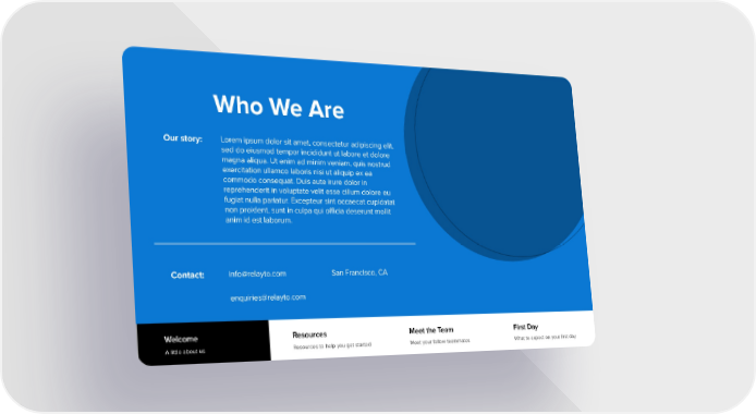 Who We Are Lorem ipsum dolor sit amet, consectetur adipiscing elit, Our story: sed do eiusmod tempor incididunt ut labore et dolore magna aliqua. Ut enim ad minim veniam, quis nostrud exercitation ullamco laboris nisi ut aliquip ex ea commodo consequat. Duis aute irure dolor in reprehenderit in voluptate velit esse cillum dolore eu fugiat nulla pariatur. Excepteur sint occaecat cupidatat non proident, sunt in culpa qui officia deserunt mollit anim id est laborum. [email protected] San Francisco, CA Contact: [email protected] Welcome Resources Meet the Team First Day A little about us Resources to help you get started Meet your fellow teammates What to expect on your first day