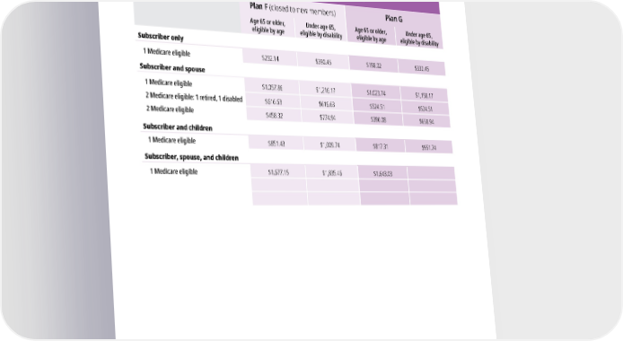 Medicare supplement plan premiums If a Medicare supplement plan is selected, non-Medicare members are enrolled in UMP Classic. The rates shown re昀氀ect the total due, including premiums for both plans. Note: These Medicare premiums do not include your Medicare Part B premium. Premera Blue Cross Plan F (closed to new members) Plan G Age 65 or older, Under age 65, Age 65 or older, Under age 65, eligible by age eligible by disability eligible by age eligible by disability Subscriber only 1 Medicare eligible $232.14 $390.45 $198.02 $332.45 Subscriber and spouse 1 Medicare eligible $1,057.86 $1,216.17 $1,023.74 $1,158.17 2 Medicare eligible: 1 retired, 1 disabled $616.63 $616.63 $524.51 $524.51 2 Medicare eligible $458.32 $774.94 $390.08 $658.94 Subscriber and children 1 Medicare eligible $851.43 $1,009.74 $817.31 $951.74 Subscriber, spouse, and children 1 Medicare eligible $1,677.15 $1,835.46 $1,643.03 4