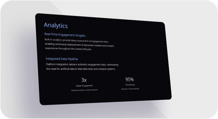 Analytics Real-Time Engagement Insights Integrated Data Pipeline 3x Higher Engagement Interactive content vs. static documents 95% Time Savings Reduction in manual reporting Built-in analytics provide deep assessment of engagement data, enabling continuous improvement of document creation and content experiences throughout the content lifecycle. Platform integration delivers authentic engagement data—eliminating the need for artificial data to feed data lakes and analytics systems.