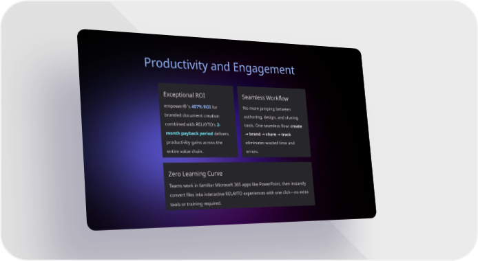 Productivity and Engagement Exceptional ROI empower® 's 407% ROI for branded document creation combined with RELAYTO's 2- month payback period delivers productivity gains across the entire value chain. Seamless Workflow No more jumping between authoring, design, and sharing tools. One seamless flow: create brand share track → → → eliminates wasted time and errors. Zero Learning Curve Teams work in familiar Microsoft 365 apps like PowerPoint, then instantly convert files into interactive RELAYTO experiences with one click—no extra tools or training required.