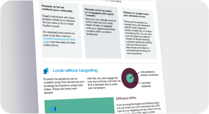 Audience targeting Existing connections targeting Yes, Core Audience Targeting is a big help in finding a large and relevant audience. But maybe you’re looking for a more specific group of people? Here’s where you find people who have already shown interest in your brand. People who’ve People who’ve seen People or customers visited your website or engaged with past you already know Tweets Target individuals who have Now you can retarget anyone These are the people you already visited your website. who’s watched your video, already know are interested. All you have to do is install liked a Tweet, or engaged Identify them based on Twitter’s pixel. with your organic/promoted emails, Twitter IDs, or mobile content within a certain advertising IDs. You can also For detailed instructions on timeframe. work through an Audience how to do this, visit our Partner to import existing Custom Audiences for Web customer audiences directly page that has step-by-step into your Ads account. instructions. Reconnect with them or exclude them to focus on new acquisition. Look-alikes targeting Core audience & existing connections Expand the audience you’ve that like, act, and engage the created using Core Audiences and way your existing customers do. Existing Connections using Look- This is the best way to scale Look-alike alikes. These are brand new your campaigns. audiences people Efficient CPEs If you’re using the target cost bidding model, you can lower your bid to decrease your CPE. Look at your targeting and see what is driving Pro Tip #2 efficient (aka, low) CPEs. Add in similar targeting. On the flip side, if you have targeting that’s driving high CPEs, make sure Have more questions about targeting? Visit our you remove that. Look at your creative, too. detailed Q&As on: Device targeting | Geo, gender, Some creatives can driver higher CPEs than and language targeting | Interest and follower others. Review your creative, bid/budget, and targeting | Keyword targeting | Custom Audiences targeting over time to further refine your campaign and achieve the results you’re looking for. 16
