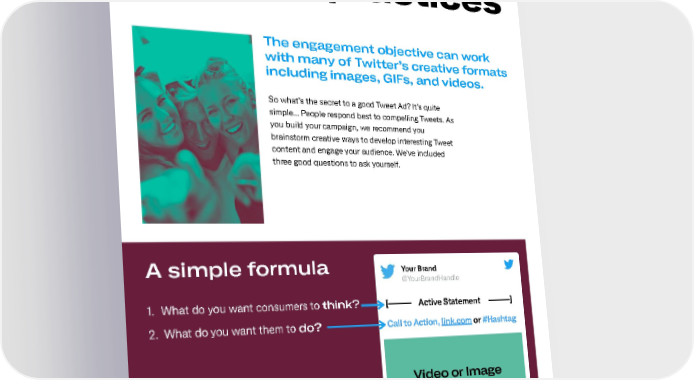 Creative best practices The engagement objective can work with many of Twitter’s creative formats including images, GIFs, and videos. So what’s the secret to a good Tweet Ad? It’s quite simple... People respond best to compelling Tweets. As you build your campaign, we recommend you brainstorm creative ways to develop interesting Tweet content and engage your audience. We've included three good questions to ask yourself. A simple formula Your Brand @YourBrandHandle 1. What do you want consumers to think? [——— Active Statement ———] 2. What do you want them to do? Call to Action, link.com or #Hashtag Video or Image 3. How do you want them to feel? 11