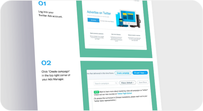 How to get started Launching an Engagement campaign 01 Log into your Twitter Ads account. 02 Click "Create campaign" in the top right corner of your Ads Manager. 20