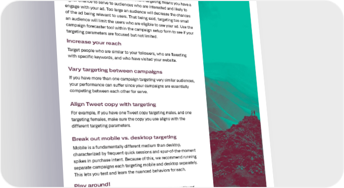 Audience targeting Other targeting tips to optimize your campaign Target with focus Creating campaigns with focused, relevant targeting means you have a higher chance to serve to audiences who are interested and likely to engage with your ad. Too large an audience will decrease the chances of the ad being relevant to users. That being said, targeting too small an audience will limit the users who are eligible to see your ad. Use the campaign forecaster tool within the campaign setup form to see if your targeting parameters are focused but not limited. Increase your reach Target people who are similar to your followers, who are Tweeting with specific keywords, and who have visited your website. Vary targeting between campaigns If you have more than one campaign targeting very similar audiences, your performance can suffer since your campaigns are essentially competing between each other for serve. Align Tweet copy with targeting For example, if you have one Tweet copy targeting males, and one targeting females, make sure the copy you use aligns with the different targeting parameters. Break out mobile vs. desktop targeting Mobile is a fundamentally different medium than desktop, characterized by frequent quick sessions and spur-of-the-moment spikes in purchase intent. Because of this, we recommend running separate campaigns each targeting mobile and desktop separately. This lets you test and learn the nuanced behaviors for each. Play around! One of the most important things you can do to drive continued campaign performance is to test what works for you and your campaigns. While it makes sense to run always-on campaigns, you’ll want to continually refresh and optimize your campaigns, given Twitter’s ever-changing, real-time nature. Remove low performing keywords, interests, and handles, and replace them with ones that are similar to the high performing ones. 17