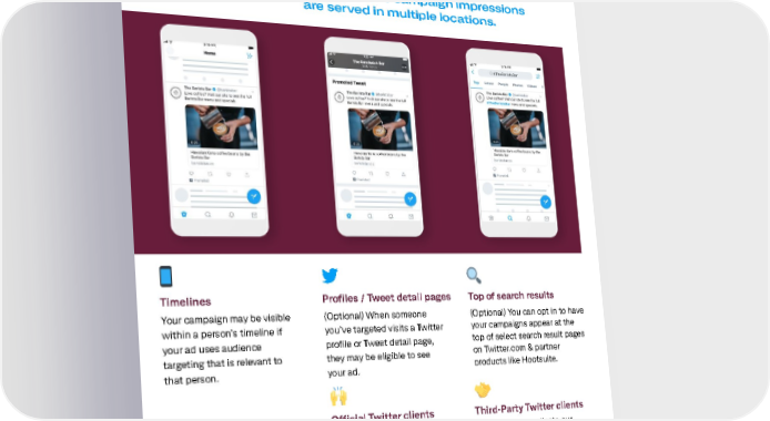 Where your ads appear Engagements campaign impressions are served in multiple locations. Timelines Profiles / Tweet detail pages Top of search results Your campaign may be visible (Optional) When someone (Optional) You can opt in to have within a person’s timeline if you’ve targeted visits a Twitter your campaigns appear at the your ad uses audience profile or Tweet detail page, top of select search result pages targeting that is relevant to they may be eligible to see on Twitter.com & partner that person. your ad. products like Hootsuite. Official Twitter clients Third-Party Twitter clients Engagement campaigns from We currently syndicate our our advertising partners may Twitter Ads suite to some third- also be displayed through party Twitter clients. You can Twitter’s official desktop and customize where you'd like your mobile clients, including Tweets to appear on the TweetDeck, Twitter for iPhone, "Creatives" tab during campaign and Twitter for Android, and setup. more. 06