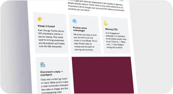 Creative best practices Here’s the kind of copy we recommend. While images and video are responsible for the majority of attention, people actually read on Twitter (more so than other platforms) so it’s important to think through your copy and CTAs. Below are some best practices you can follow. Keep it brief Focus your Strong CTA Even though Twitter allows message In an Engagement 280 characters, brevity is We know you have a lot to campaign, it is important key for brands. The sweet say, but don't boil the to tell people exactly what spot for driving awareness ocean in one Tweet. Try to to do (“Click to...”, “Reply and favorability are Tweets keep Tweet copy as with...”). Don’t forget a with 50-100 characters. simple and focused on strong call to action. serving one purpose. Connect copy + content Copy and content go hand- in-hand. Make sure to make a clear connection between the video or image, and the accompanying copy. 12