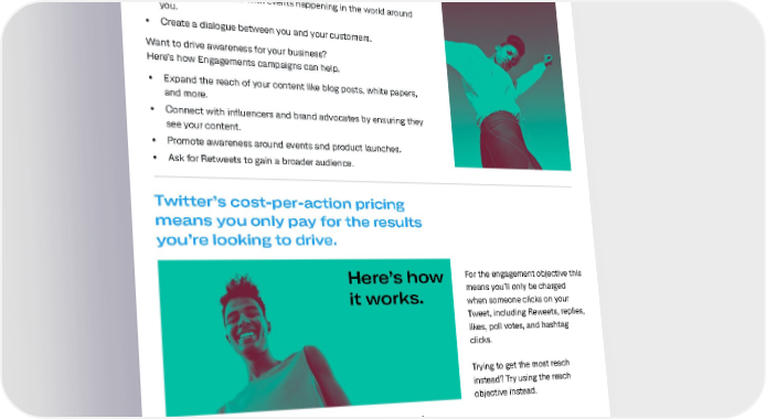 Overview Here are all the things you can do with engagements campaigns. • Announce new product launches or product benefits. • Connect your brand with events happening in the world around you. • Create a dialogue between you and your customers. Want to drive awareness for your business? Here’s how Engagements campaigns can help. • Expand the reach of your content like blog posts, white papers, and more. • Connect with influencers and brand advocates by ensuring they see your content. • Promote awareness around events and product launches. • Ask for Retweets to gain a broader audience. Twitter’s cost-per-action pricing means you only pay for the results you’re looking to drive. Here’s how For the engagement objective this it works. means you’ll only be charged when someone clicks on your Tweet, including Reweets, replies, likes, poll votes, and hashtag clicks. Trying to get the most reach instead? Try using the reach objective instead. In an engagement campaign, you’re only charged for every 1,000 Tweet engagements. What you pay per engagement depends on your budget, bid, and the targeting you select. As part of this offering, you’ll get real-time bid guidance based on your targeting goals. Want to know more? Read up on Twitter Ad pricing. 04
