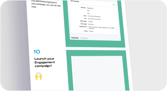 How to get started 09 Review your final campaign setup on the "Review & Complete" tab. If you'd like to add additional ad groups to your campaign, you can do that here. 10 Launch your Engagement campaign! 24