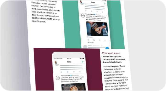 Ad formats Promoted video Promoted Video lets you promote a video from a brand's Twitter account. The video autoplays when shown in a person's timeline. Promoted Video is a proven video ad solution that drives brand metrics and sales. Stick to this tried-and-true ad format, or take it a step further and use additional features to achieve specific goals. Promoted image Reach a wider group of people or spark engagement from existing followers. Promoted Images are Tweets that are paid for by our advertisers to reach a wider group of users or to spark engagement from their existing followers. These appear in your Home timeline, at the top of search results on Twitter and elsewhere on the platform, and are clearly marked as "Promoted”, but act just like regular Tweets and can be Retweeted, replied to, liked, and more. 08