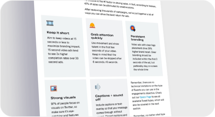 Creative best practices Our recommendations for creative. Ad creative is the #1 factor in driving sales. In fact, according to Nielsen, 47% of sales can be attributed to creative alone. After reviewing thousands of campaigns, we’ve put together a list of ways you can drive the best return for ads. Keep it short Grab attention Persistent Aim to keep videos at 15 quickly branding seconds or less to Use movement and show Video ads with clear logo maximize branding impact. talent in the first few placement drive 36% 15 second video ads tend seconds of your video. higher brand recall. Clear to see 3x higher Keep in mind that the branding should be completion rates over 30 video can be skipped after included within the first 3 second ads. 6 seconds.r 6 seconds. seconds of the ad, but preferably stay on-screen the whole time Remember, there are no technical limitations on the type of Tweets you can use in the Strong visuals Captions + sound engagements objective. Check off out our Specs Page to see all 97% of people focus on available Tweet types, which will visuals on Twitter, so Include captions or text- also be covered in the next make sure it’s eye- overlay so that your message section. catching and features comes through without your product or key sound. Closed captions and Remember, no matter what type message. text overlays create 28% of Tweet you use, you'll only be longer view times on Twitter billed for engagements, which and Average ROI is 1.8x includes Retweets, replies, likes, higher for videos that don’t poll votes, and hashtag clicks. require sound to be understood. 13