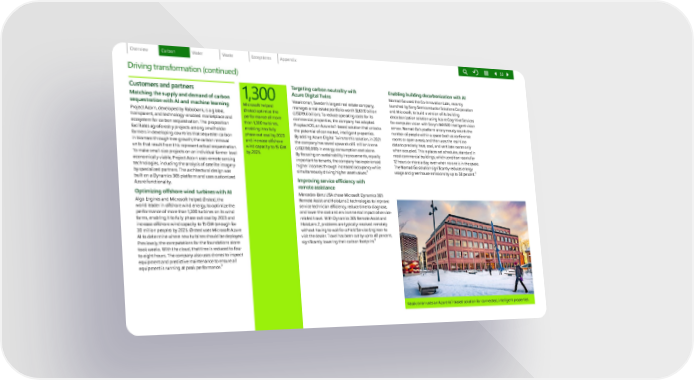 Driving transformation (continued) Customers and partners Matching the supply and demand of carbon sequestration with AI and machine learning Project Acorn, developed by Rabobank, is a global, transparent, and technology-enabled marketplace and ecosystem for carbon sequestration. The proposition facilitates agroforestry projects among smallholder farmers in developing countries that sequester carbon in biomass through tree growth; the carbon removal units that result from this represent actual sequestration. To make small-size projects on an individual farmer level economically viable, Project Acorn uses remote sensing technologies, including the analysis of satellite imagery by specialized partners. The architectural design was built on a Dynamics 365 platform and uses customized Azure functionality. Optimizing offshore wind turbines with AI Algo Engines and Microsoft helped Ørsted, the world leader in offshore wind energy, to optimize the performance of more than 1,300 turbines on its wind farms, enabling it to fully phase out coal by 2023 and increase offshore wind capacity to 15 GW (enough for 30 million people) by 2025. Ørsted uses Microsoft Azure AI to determine where new turbines should be deployed. Previously, the computations for the foundations alone took weeks. With the cloud, that time is reduced to four to eight hours. The company also uses drones to inspect equipment and predictive maintenance to ensure all equipment is running at peak performance. 8 1,300 Microsoft helped Ørsted optimize the performance of more than 1,300 turbines, enabling it to fully phase out coal by 2023 and increase offshore wind capacity to 15 GW by 2025. Targeting carbon neutrality with Azure Digital Twins Vasakronan, Sweden’s largest real estate company, manages a real estate portfolio worth SEK170 billion (USD19.6 billion). To reduce operating costs for its commercial properties, the company has adopted ProptechOS, an Azure IoT-based solution that unlocks the potential of connected, intelligent properties. By adding Azure Digital Twins to this solution, in 2021 the company has saved upwards of 6 million krona (USD700,000) in energy consumption cost alone. By focusing on sustainability improvements, equally important to tenants, the company has experienced higher incomes through increased occupancy while simultaneously driving higher asset values. 8 Improving service efficiency with remote assistance Mercedes-Benz USA chose Microsoft Dynamics 365 Remote Assist and HoloLens 2 technologies to improve service technician efficiency, reduce time to diagnose, and lower the cost and environmental impact of service- related travel. With Dynamics 365 Remote Assist and HoloLens 2, problems are typically resolved remotely without having to wait for a Field Service Engineer to visit the dealer. Travel has been cut by up to 40 percent, significantly lowering their carbon footprint. 8 Enabling building decarbonization with AI Nomad Go used the Co-Innovation Labs, recently launched by Sony Semiconductor Solutions Corporation and Microsoft, to build a version of its building decarbonization solution using Azure Cognitive Services for computer vision with Sony’s IMX500 intelligent vision sensor. Nomad Go’s platform anonymously counts the number of people within a space (such as conference rooms or open areas), and then uses the real-time data to precisely heat, cool, and ventilate rooms only when occupied. This replaces set schedules, standard in most commercial buildings, which condition rooms for 12 hours or more a day, even when no one is in the space. The Nomad Go solution significantly reduces energy usage and greenhouse emissions by up to 38 percent. 8 Vasakronan uses an Azure IoT-based solution for connected, intelligent properties. 33