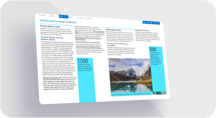 57 Enabling systems change (continued) Driving collective action We partner with like-minded companies and leading scientific organiz ations to develop and deliver research, guidance, and implem entation roadmaps that enable all businesses to solve water challenges. CEO Water Mandate and Water Resilience Coalition Acknowledging the importance of collective action and collaboration to solve shared water challenges, Microsoft has endorsed the United Nations Global Compact CEO Water Mandate, an initiative in co-Secretariat with the Pacific Institute, si nce 2018. In 2020, Microsoft and six other companies, t ogether with the UN Global Compact CEO Water Mandate, spearheaded the establishment of the industry-driven Water Resilience Coalition (WRC). Microsoft serves as a Coalition leader and has pledged its commitment to collective action, net positive water impact, resilient value chain, and global leadership. We are committed to working with the Water Resilience Coalition and its more than 30 members to make progress against the WRC’s 2030 roadmap for collective action. Microsoft is also advancing the development of tools and resources to enable companies to step forward by assessing and improving their water stewardship actions in partnership with the CEO Water Mandate. Water Action Hub Plat form 4.0 was first presente d during the 2021 World Water Week, was developed by the CEO Wat er Mandate and made possible with support from Microsoft. This latest version of the hub connects more than 1,500 projects with over 1,000 partner organizations worldwide. It also helps direct users to water tools by Ecolab, WWF, WRI, and other leading organizations. Nature-Based Soluti ons Tool is a web-based tool developed to serve as a key starting point for organizations looking to invest in nature-based solut ions (NBS) , and for those wishing to learn more about benefit identification and accounting. The tool was developed based on and in accord ance with the published Benefit Accountin g of Nature-Based Solutions for Watersheds Guide . California Water Action Collaborative Convened and facilitated by Ag Innovations, the California Water A ction Collaborative (CWAC) is a network for divers e stakeholders to come together and pursue collective action projects that will improve California’s water resilience for people, business, agriculture, and nature. 1,500 The Water Action Hub platform connects 1,500 projects with 1,000 partner organizations worldwide. Advocating for water Governments play a fundamental role in ensuring the availability of safe and clean drinking water, maintaining and expanding water infrastructure, protecting critical water ecosystems, and responding to water crises. As a leading company committed to using its voice for policy, Microsoft has engaged in the following activities. Promoting US water infrastructure and resilience Microsoft advocated for clean energy and environmental provisions in the US I nfrastructure Investment and Jobs Act, which commit s over $8 billion for western water infrastructur e and significant funding for water-related and other resilie nce efforts. Supporting WaterEurope In 2020, Microsoft joined WaterEurope, the leading association in Europe focused on technology and innovation aspects of water, with a focus on digital water. We have called for the inclusion of water-related topics in EU polices, such as water infrastructure into the COVID-19 recovery packages. Governments play a key role in ensuring the availability of safe and clean water. $8B The US Infrastructure Investment and Jobs Act commits over $8 billion for western water infrastructure and significant funding for water-related and other resilience efforts.